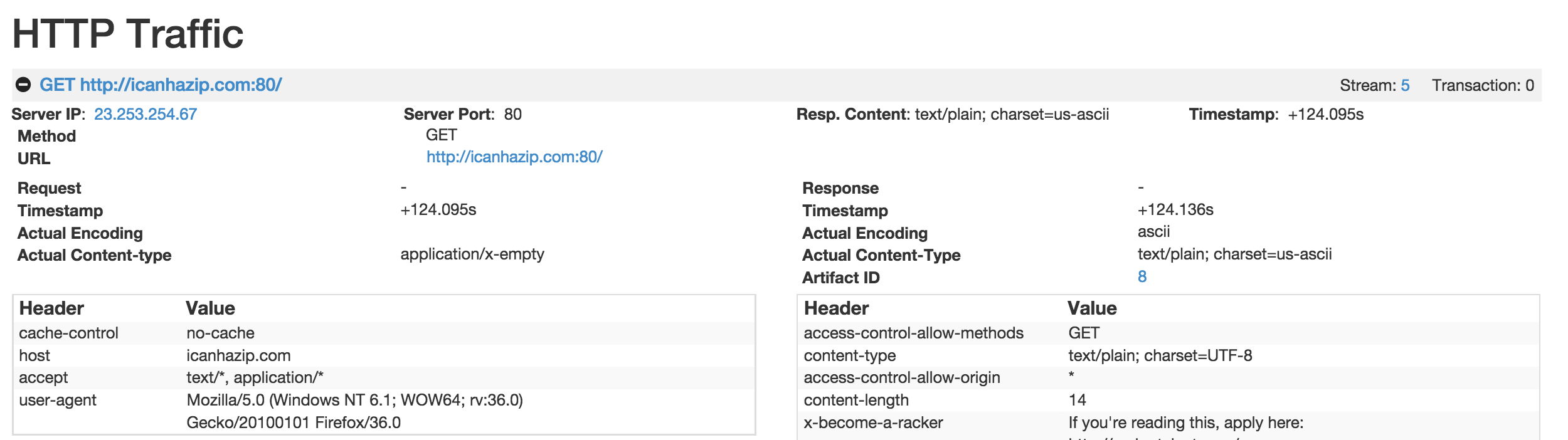 While researching these campaigns and behavior new variants of Upatre was identified by Talos on April 13th. This variant makes some major changes to the previous behavior of Upatre. The previous samples all made GET requests to checkip.dyndns.org in order to obtain the IP address of the compromised system. That was followed up with the GET requests shown above. This new variant has shifted to icanhazip.com as the site used for IP identification. The User-Agent used during the communication by Upatre to date have been non-standard and somewhat unique. User-Agents such as “Mazilla/5.0” have been used for several months, while in the past, other User-Agents such as “testupdate”, “onlyupdate”, etc have been used. This new variant has changed that to “Mozilla/5.0 (Windows NT 6.1; WOW64; rv:36.0) Gecko/20100101 Firefox/36.0” which is a more standard User Agent again driven to hinder detection, as seen in Figure 9, below.