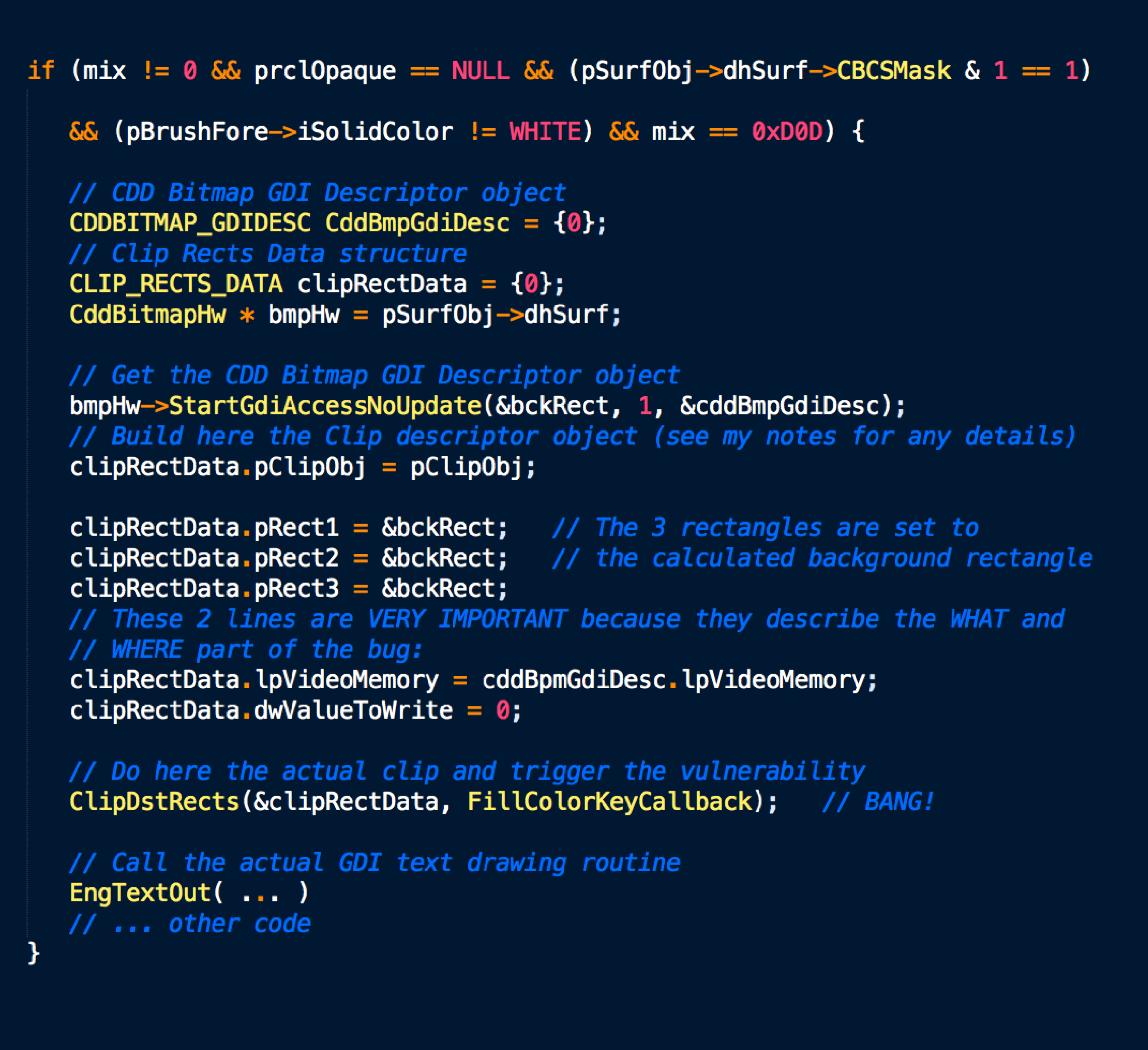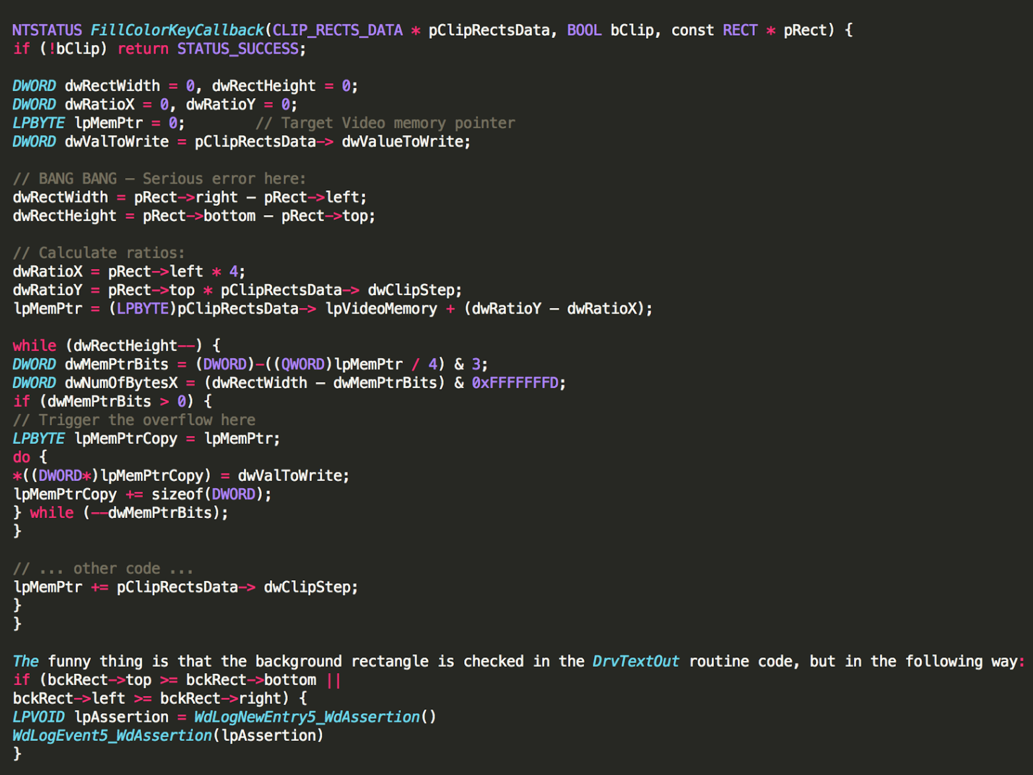The ClipDstRect routine performs the actual clipping based on the complexity of the Clip object. If the complexity is DC_TRIVIAL, the CPU cache is flushed and the callback routine is called. However, the FillColorKeyCallback routine contains a flaw in that it doesn’t properly check the width and height of the rectangle.