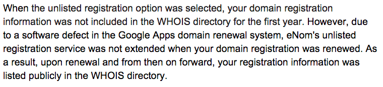 I’ve also raised two support tickets with Google over the past two years to get this fixed on my account each time. Support advised that they were no longer offering ‘private registration’ as an option on renewal with Enom and to transfer to another registrar if this was required…