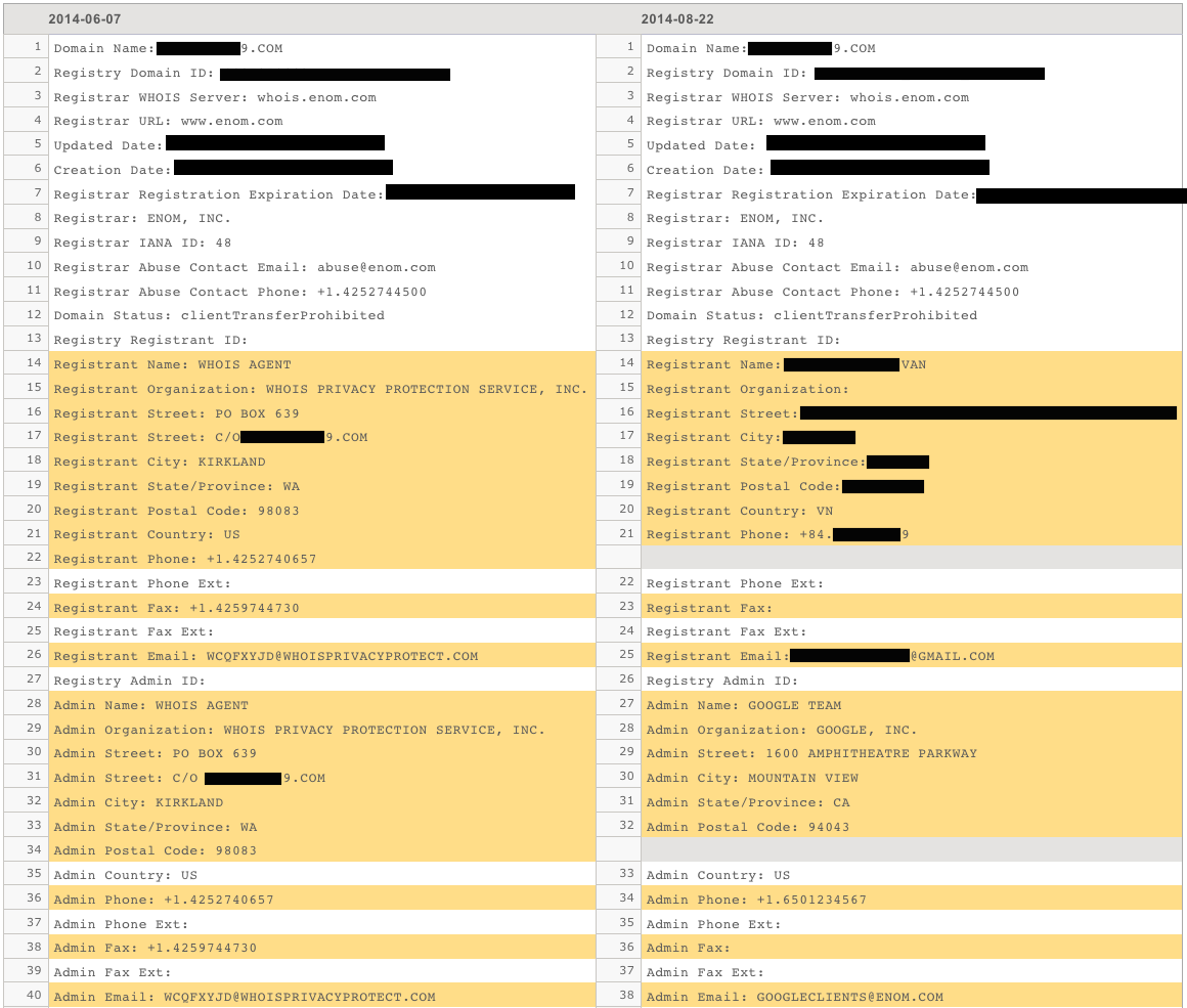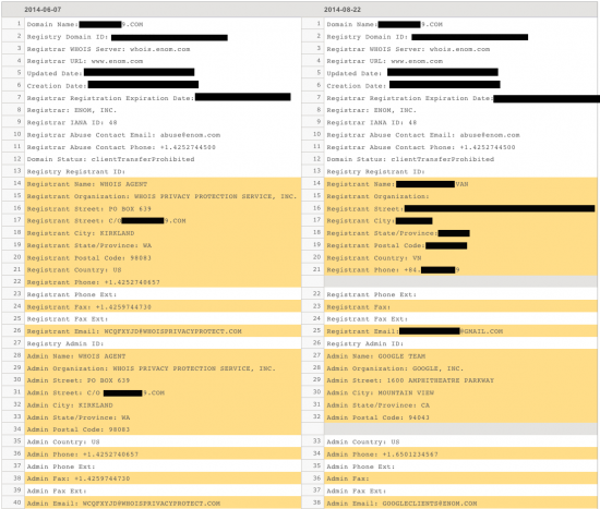 In mid-2013, a problem occurred that slowly began unmasking the hidden registration information for owners’ domains that had opted into WHOIS privacy protection. These domains all appear to be registered via Google App [1], using eNom as a registrar. At the time of writing this blog, there are 305,925 domains registered via Google’s partnership with eNom. 282,867 domains, or roughly 94% appear have been affected [2]. (Google reports that new domains which have not faced a renewal period are not affected and many businesses do not opt into their privacy service.) The information disclosed included full names, addresses, phone numbers, and email addresses for each domain. The information was leaked in the form of WHOIS records.