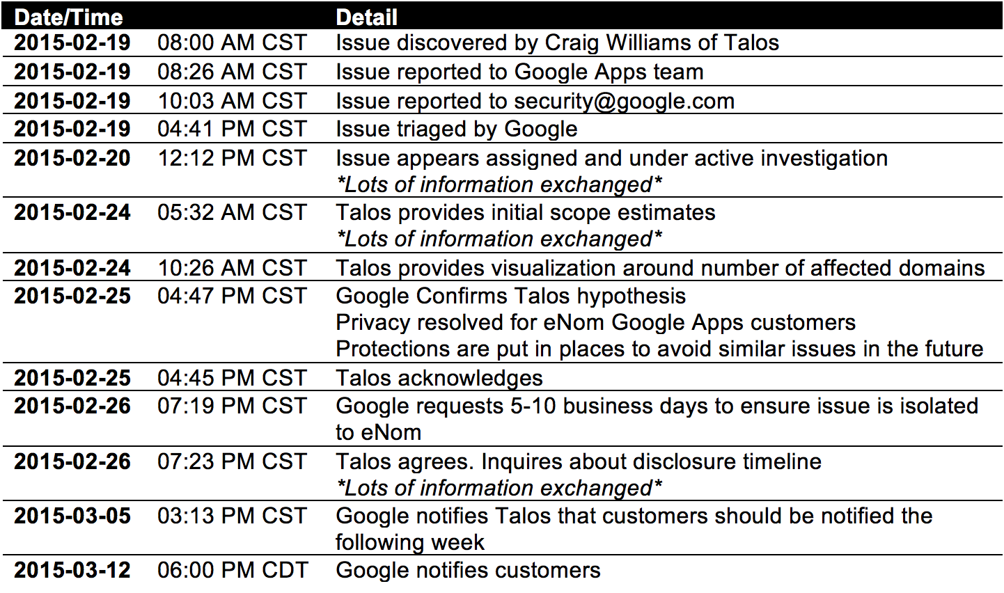 Cisco Talos became aware of this problem and immediately notified the Google security team. Within days the privacy settings were restored to the affected domains.