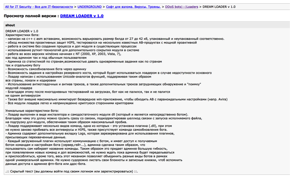 One thing I observed during my analysis was a relatively unknown botnet kid known as “DREAM LOADER v1.0″. If you look closely to the command and control options offered by this botnet kit, you will see a strong similitude of commands between this and Havex – the command set is nearly identical.