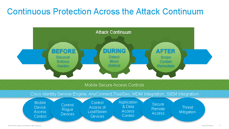 Let’s take a closer look at the initial mobile protection layer—Cisco’s secure access controls include: Identity Services Engine, AnyConnect, Trustsec and ISE integrations with Mobile Device Management (MDM) and SIEM.