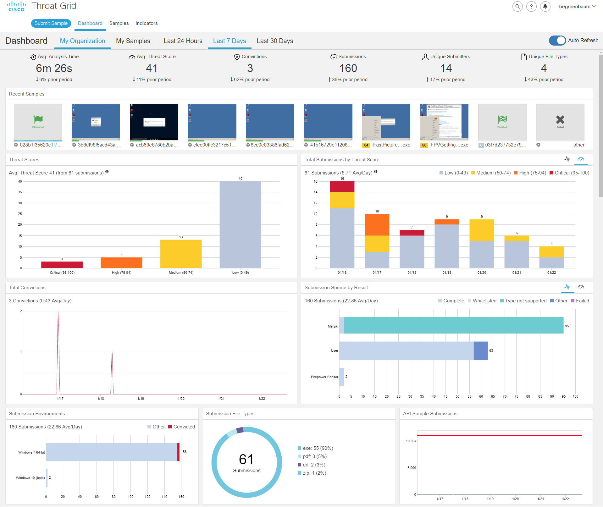 In addition to a consistent look and feel and organizational details, there are a number of new panels that visually highlight statistics on your submissions that allow you to easily check in on the general status of your organization submissions and Threat Grid usage.