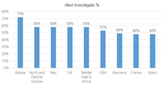 The European situation as shown by the Cisco 2018 Security Capabilities Benchmark Study (SCBS), compiled through interviews given by 956 CISOs in 8 European countries, reveals that the average percentage of alerts that are investigated is 57% overall, compared to 72% in Russia and 53% in the USA. This means that in Europe 43% of alerts are not investigated, meaning that many legitimate alerts are unremediated.