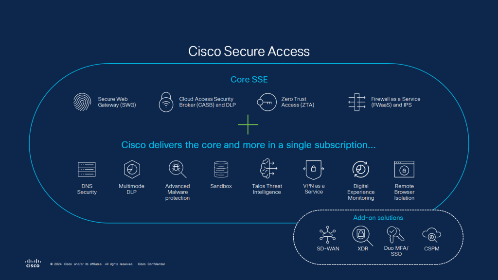 - Cisco Secure Access delivers a broad set of converged, cloud-based security services. Unlike alternatives, our approach overcomes IT complexity through a unified console with every function, including ZTA, managed from one interface. A single agent simplifies deployment with reduced device overhead. One policy engine further eases implementation as once a policy is written, it can be efficiently used across all appropriate security modules.