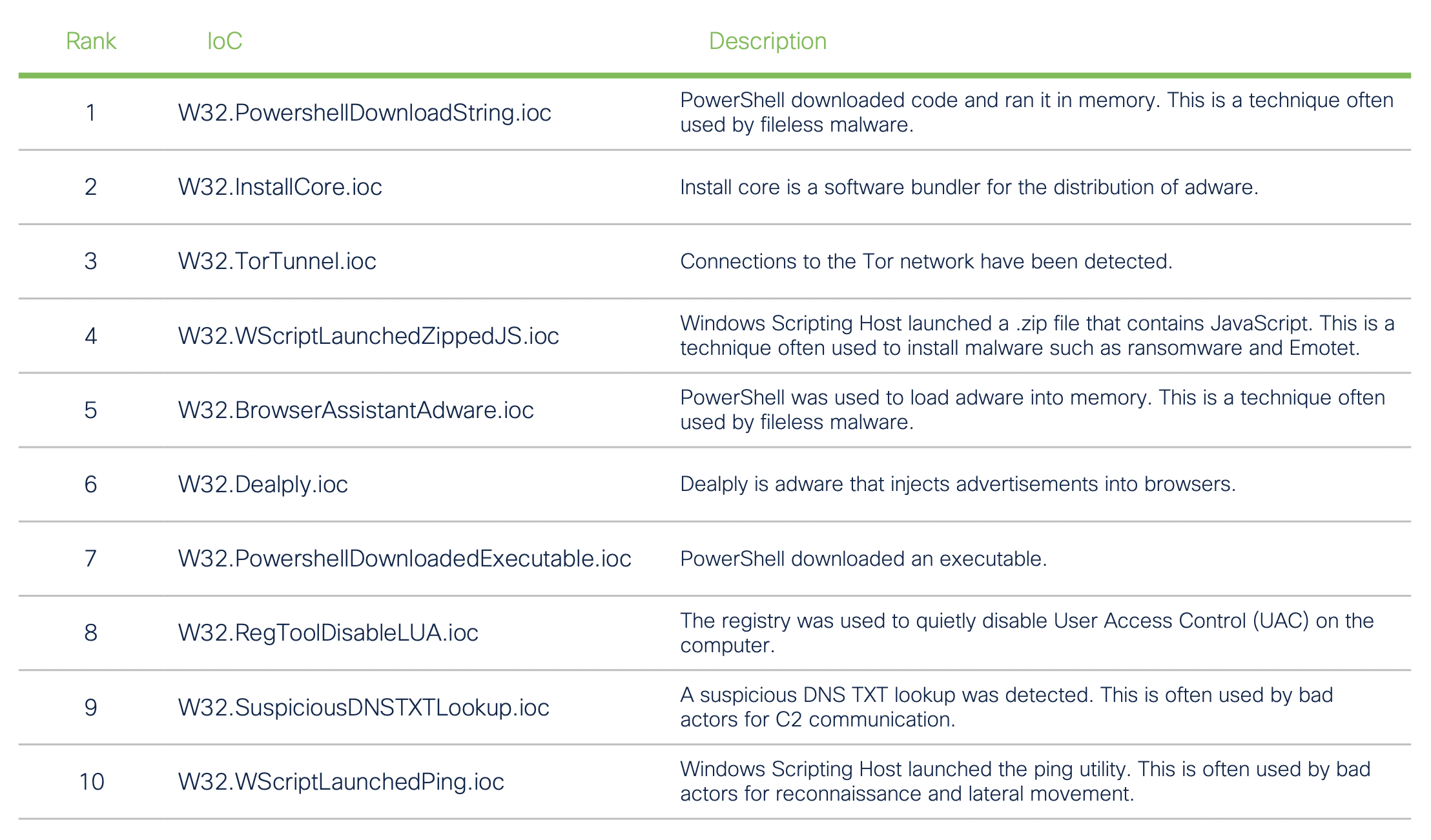 In Part 1, we took a look at critical severity threats and MITRE ATT&CK tactics that were spotted by the Indication of Compromise (IoC) feature in Cisco’s Endpoint Security solution. In this second part, we’re going to step back and look at a larger swath of the IoC alerts to see what’s most frequently encountered.