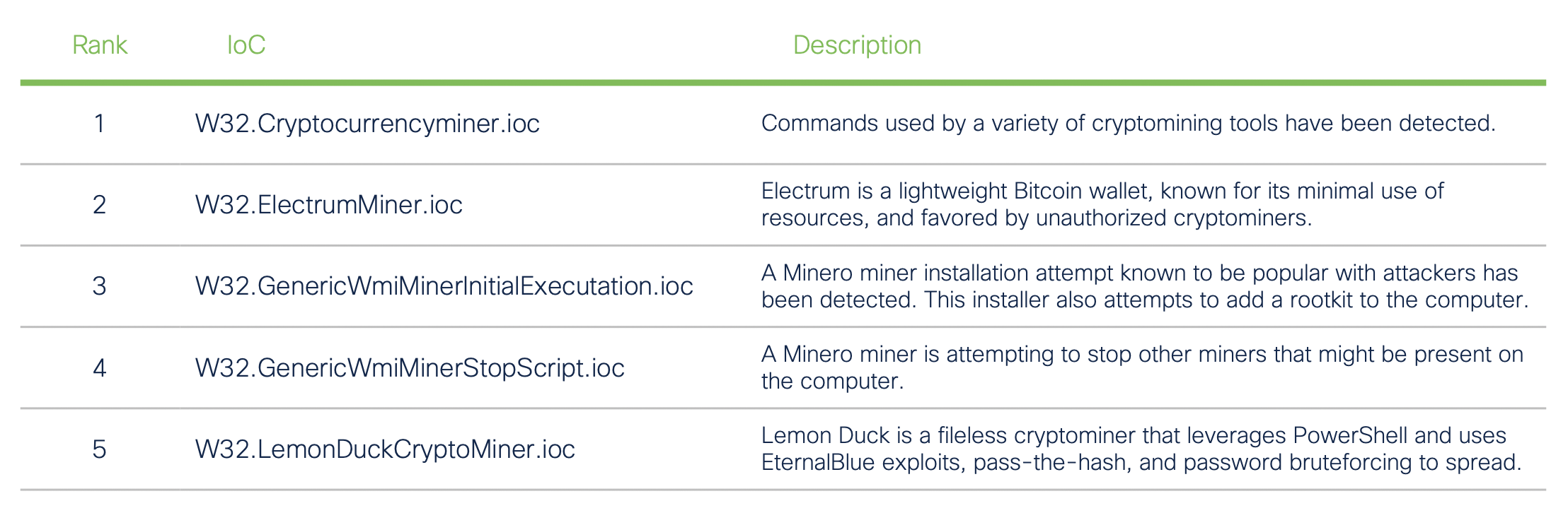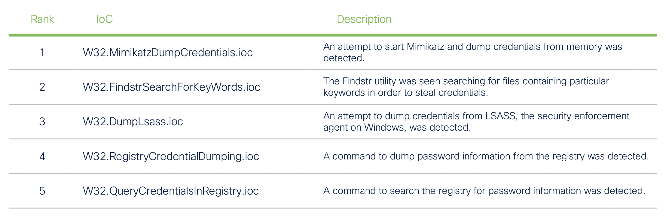 The methodology remains the same as in Part 1, which we provide again at the end of this blog. In a nutshell, the data presented here is similar to alerts you would see within the dashboard of Cisco’s Endpoint Security solution, only aggregated across organizations. This time we rank the IoCs that organizations have encountered grouped by particular topics. The data set covers the first half of 2020, from January 1st through June 30th.