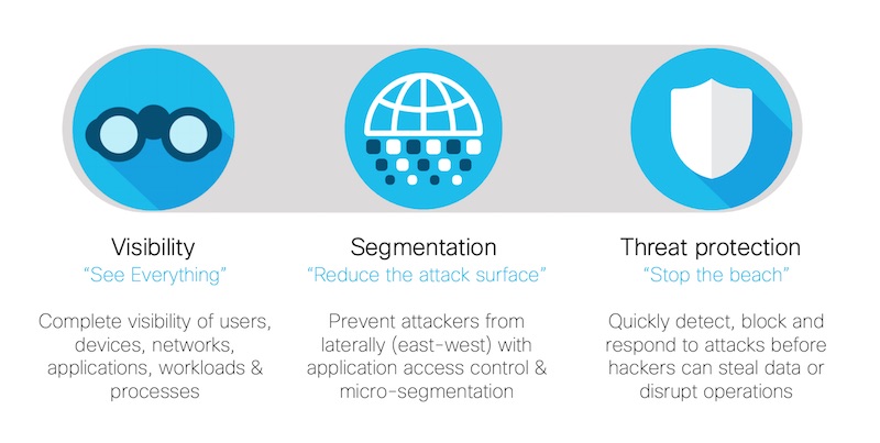 Enabling a decentralized data center environment requires a security strategy that spans three important areas: visibility, segmentation, and threat protection.