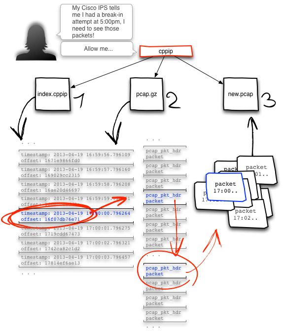 Now that you’ve got your index file built, you can actually get some work done! Say you have a pressing need for packets 3,480,123 through 4,080,012 from deep inside that pcap.gz. The infographic below depicts this typical workflow scenario: