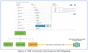 So, what does this execution look like? With the Scope mapping achieved, Secure Workload pushes the relevant policy to the Cisco Secure Firewall by way of its management platform, Secure Firewall Management Center (FMC). To maintain compliance, only the required policy rules are sent to FMC, avoiding the extra unnecessary rules because of Topology Awareness. An example of this is shown in Figure 2: