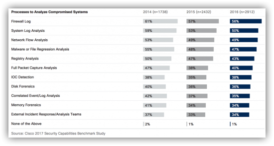 According to the Cisco 2017 Annual Cybersecurity Report, 50% of the respondents stated they used system log analysis, 36% of the respondents stated they used disk forensics, and 34% of the respondents stated they used memory forensics as a process to analyze compromised systems. All of these processes are critical to incident response. Most organizations either do not have a digital forensic capability, or fully outsource digital forensic capabilities to a 3rd party. This means that time to collection (“TTC”) critical host artifacts can be days, weeks, or even never, leading to loss of time-sensitive, or dynamic artifacts.