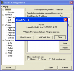 The primary mode of infection relies on users to search for PuTTY and follow a link to a fake mirror rather than the legitimate PuTTY page. To increase the chances users reach the malicious mirrors, the attackers have used search engine optimization techniques. Some HTML pages hosted on the compromised servers reference PuTTY for Mac, PuTTY for Android platforms, or even more obscure things like PuTTY and shampoo, for example. The malicious PUTTY.exe (MD5 b5c88d5af37afd13f89957150f9311ca) comes in the PE format, just like the original. This trojanized version of PuTTY maintains a user interface and function seemingly similar to the original. One difference is the binary was compiled with a different version of Microsoft Visual C++ than PuTTY traditionally has been, and results in a slightly altered user interface. Also, the “About” button reveals altered information, being listed as “Unidentified build, Nov 29 2013 21:41:02.” Given that presumable compile time, that is only a couple of months after the release of PuTTY v0.63, which labels itself as “Release 0.63” under “About.”