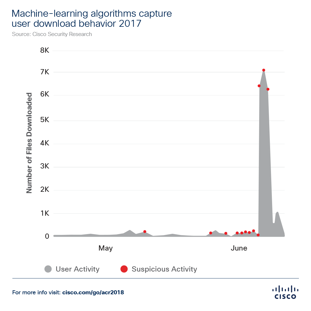 urity Report, we offer insights on the impact of the cloud on user activity—and how careful analysis of this activity could potentially unearth threats from inside an organization. Using a machine-learning algorithm, Cisco researchers looked at data exfiltration trends for 150,000 users in 34 countries, all using cloud service providers during a 6-month period from January to June 2017. The algorithm took into account not only the volume of documents being downloaded, but also variables such as the time of day of downloads, IP addresses, and locations. In the next 1.5 months, the algorithm started flagging deviations from the norm for each individual user.