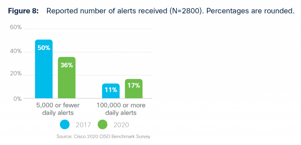 If you’re like many other organizations today, you’re getting inundated with alerts, have too many interfaces to pay attention to, and therefore wish to secure your environment with fewer products and vendors. According to the below figure from our 2020 CISO Benchmark Report, in 2017, 50% of organizations were receiving 5,000 or fewer daily security alerts. Now, only 36% of organizations fall into this category. And the amount of organizations that receive 100,000 or more daily alerts has grown from 11% in 2017 to 17% in 2020 – an albeit small, but still troubling rise. This number should be going down, not up.
