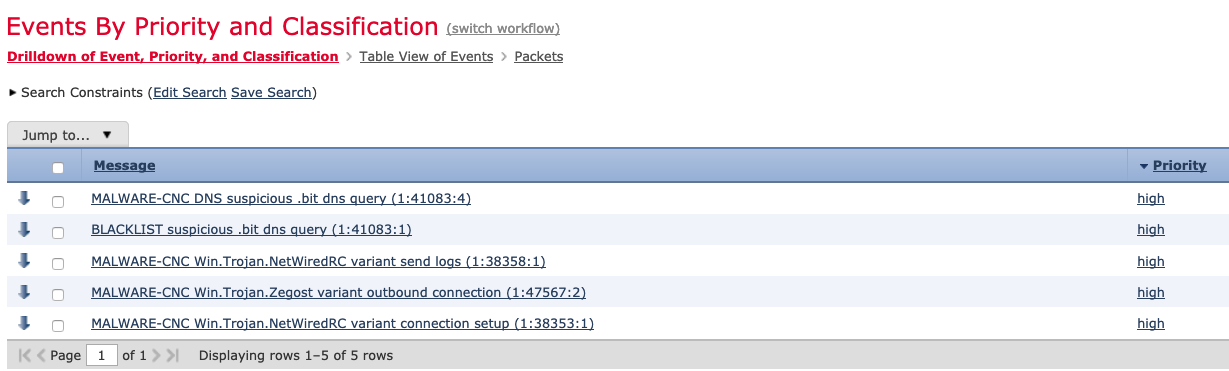 One of the Impact Flag 1 events shown below, signalling about suspicious .bit query going over DNS, and associated with a Network Trojan.