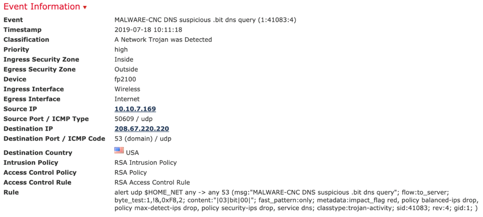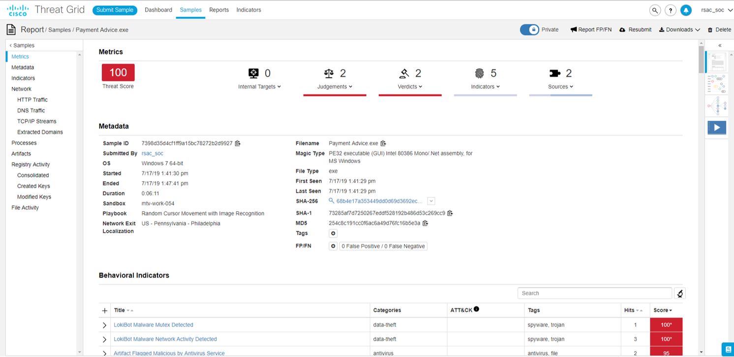 Threat Grid combines advanced sandboxing with threat intelligence into one unified solution to protect organizations from malware. Threat Grid analyzes the behavior of a file against millions of samples and billions of malware artifacts. The SOC team had a global and historical view of the malware, what it’s doing and how large a threat it posed to the RSAC network.