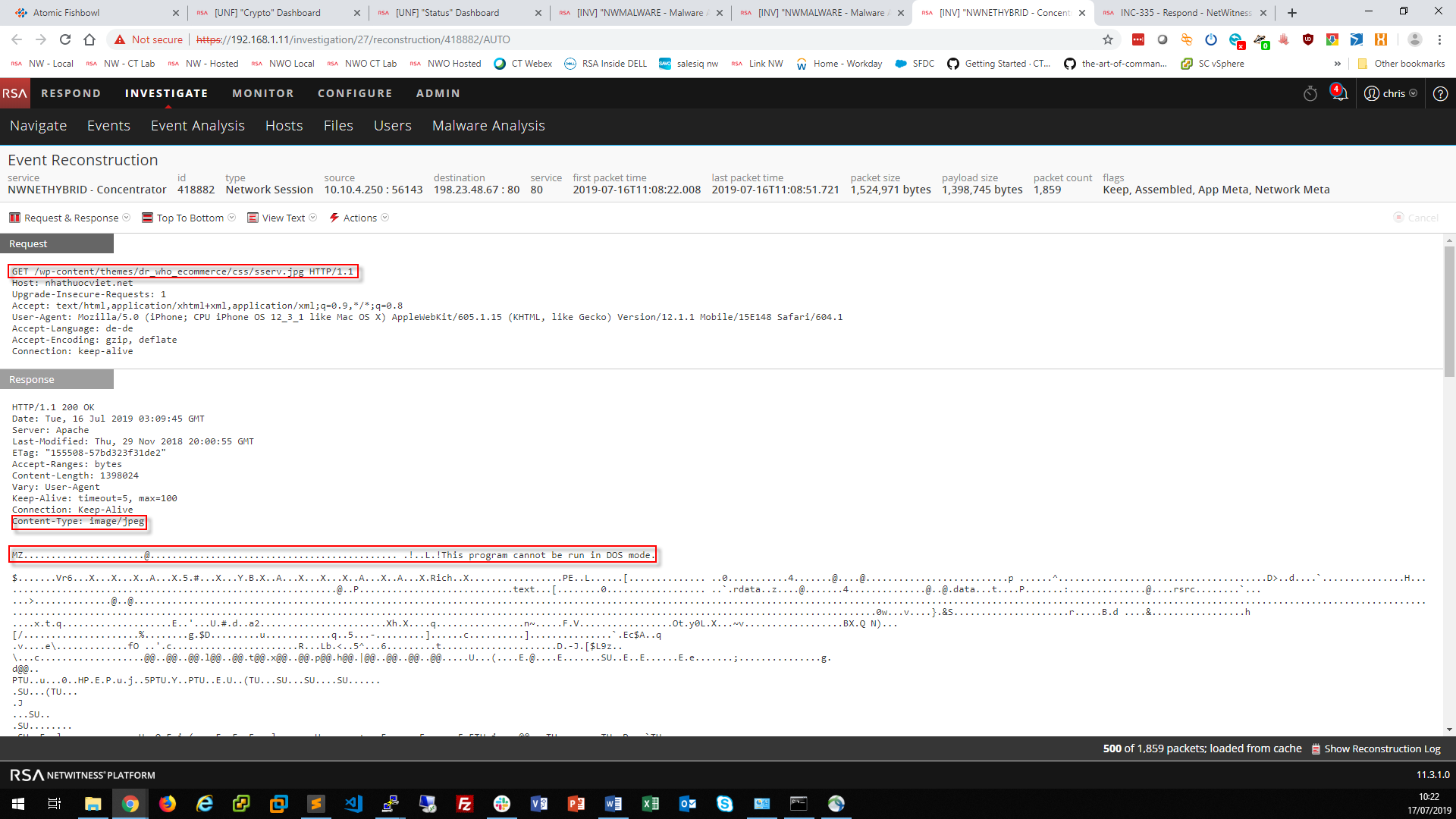 On the first day of the Conference, the SOC team observed a .JPG file served to a conference attendee who connected to a website. The .JPG file was extracted by NetWitness and found to actually have a file header of MZ, used for executables.