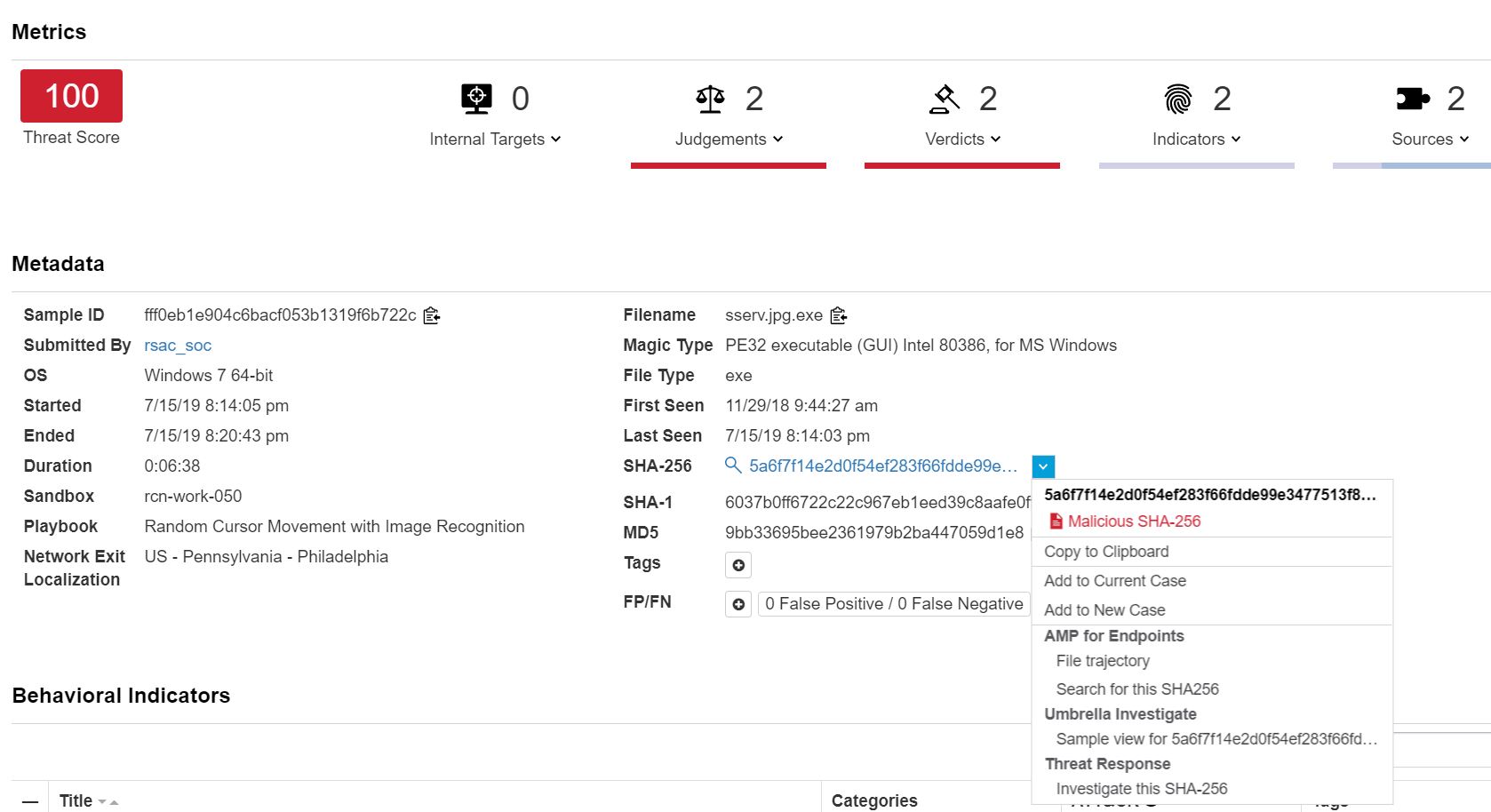 The Dynamic Analysis/Sandbox score from Threat Grid was 100, meaning confirmed malicious based on behavior. The team went into action to assess the threat.
