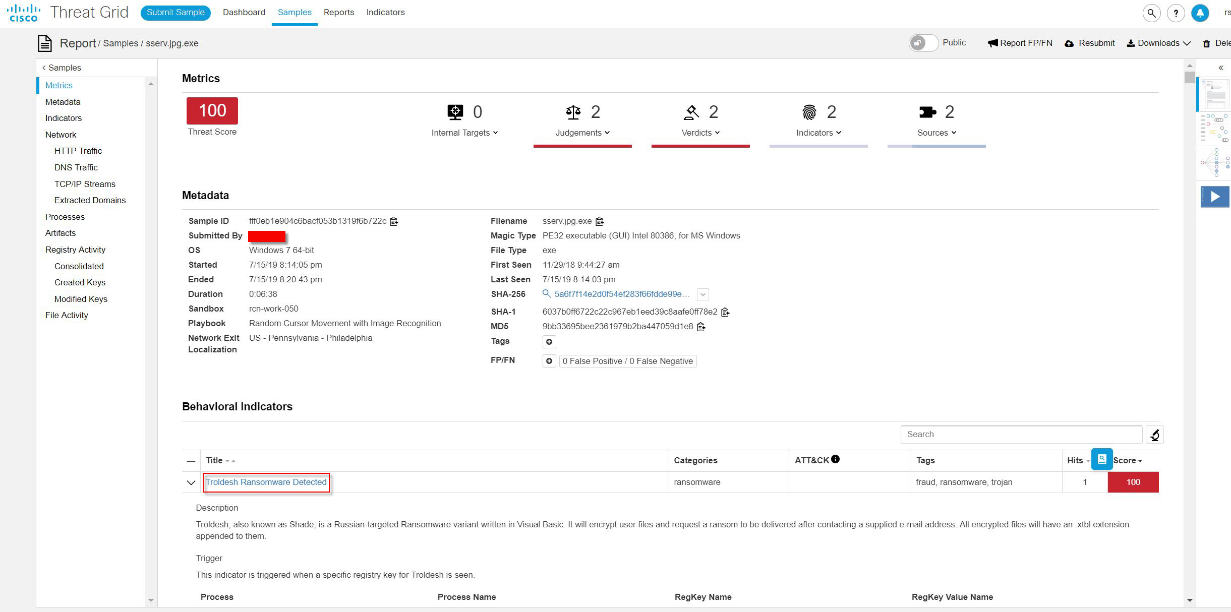 The supposed .JPG file was assigned a Threat Score of 100 for the Behavior of Troldesh Ransomware Detected. Troldesh, also known as Shade, is a Russian-targeted Ransomware variant written in Visual Basic. It will encrypt user files and request a ransom to be delivered after contacting a supplied e-mail address. All encrypted files will have an .xtbl extension appended to them.
