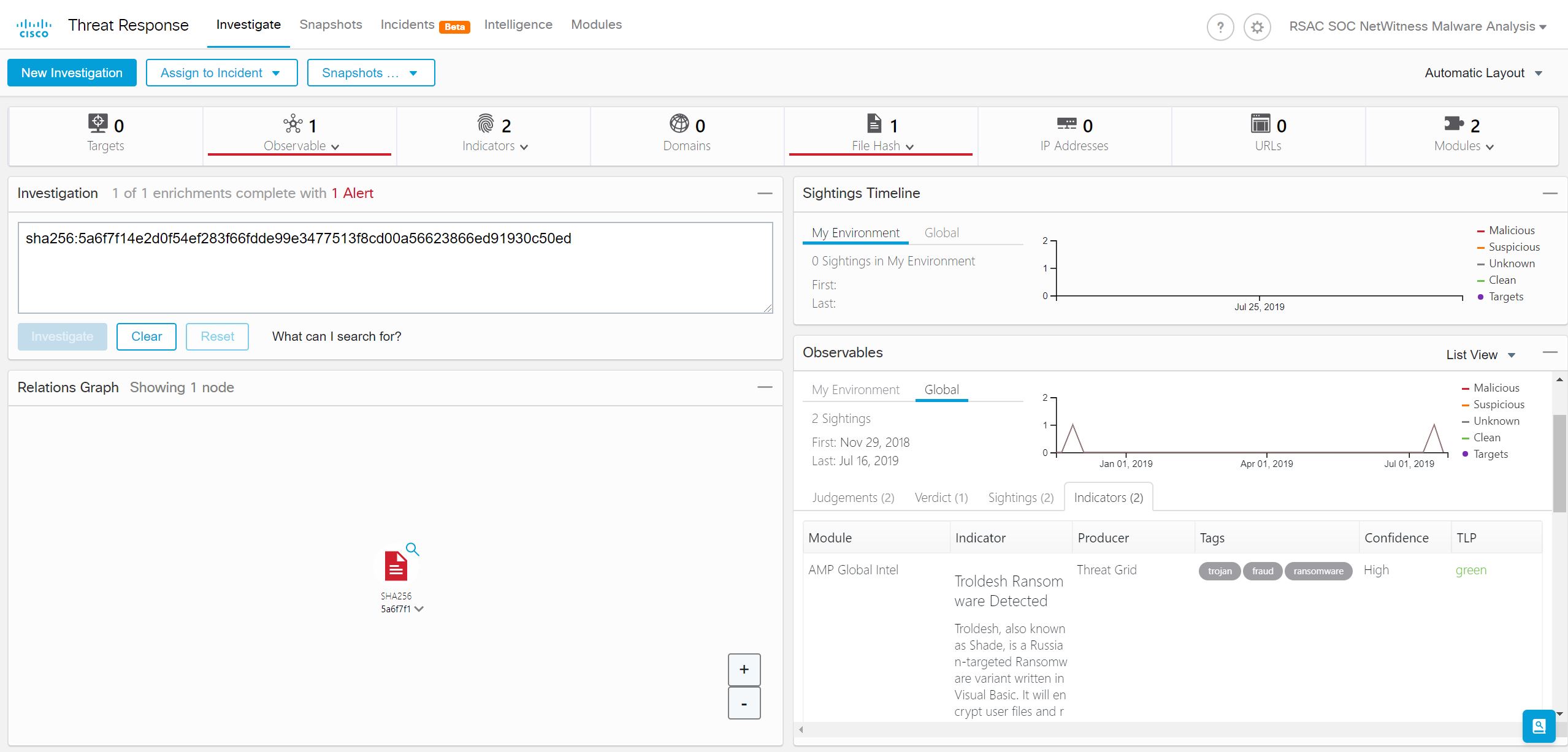 With Threat Response we were able to have a global view of the file, that it was first seen November 2018. In a production environment, this threat intelligence would have blocked the file on all integrated Cisco Security platforms.