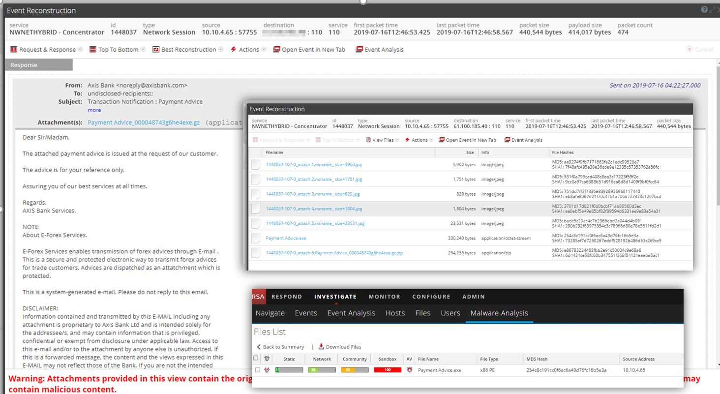 We also saw a phishing attack, masquerading as a banking email. NetWitness reconstructed the email and sent the attachments to Threat Grid for analysis.