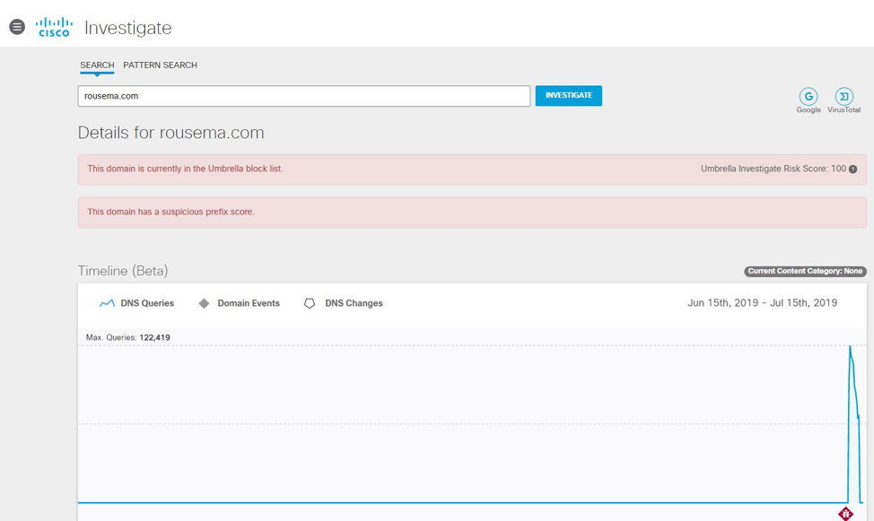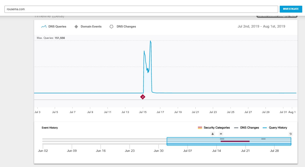 We moved to Umbrella Investigate to learn more and confirmed the sudden malicious activity of 0 DNS requests to over 120,000 global requests.