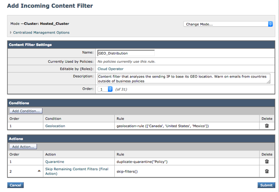 Now with the integration of Geo IP into “Content Filters” administrators can look deeper into the body and attachments of an email to decide how to process the email in question based on their geographical location. Actions such as Subject line modification, BCC’ing another recipient, attachment analysis and quarantining can be now enforced, based on business policies around geographical characteristics.