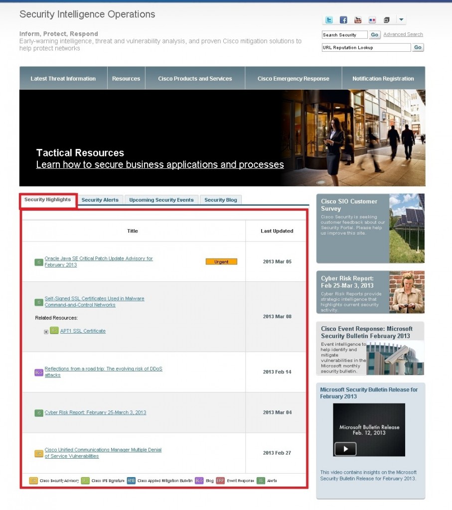 In the spirit of Robert C. Gallagher’s famous quote—and in our quest to never be a vending machine—we’ve rolled out several updates to Cisco’s Security Intelligence Operations (SIO) Portal which I trust you will find useful. Thanks to your feedback, we continue to evolve the Portal to ensure that relevant security content is where you need it, when you need it. Providing timely information to our customers requires not only a global team of Cisco security experts to pipeline the latest information, but a complementary team who ensures that the most significant issues are also the most visible. In fact, that’s the most exciting change we made: a new ‘Security Highlights’ tab which allows a cross-functional group, led by our content managers, to call out the most important issues to our customers. That way, instead of looking at IntelliShield alerts, Cisco Security Notices, or Event Responses individually when time is scarce, this new tab gives you an at-a-glance view of Cisco security content our experts feel is most pressing given all of the events into which we have a view.