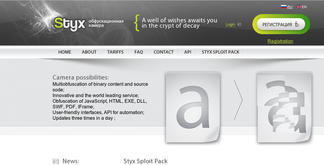 Styx is an exploit pack that gained notoriety in 2012 when it was heavily advertised in various criminal web forums. This particular exploit pack is notable because the author(s) brazenly created a website – styx-crypt.com – providing detailed information about the EP and its exploit efficacy. The following is one such 2012 advertisement: