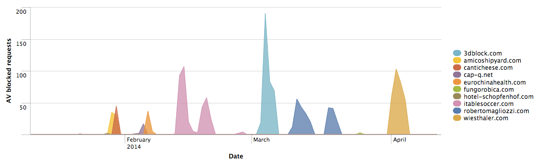 We subsequently extracted the referrers (“stage one domains”) that had driven our customers to the blocked exploit pack domains. The chart below depicts the stage one compromised domains and their rise and fall over time in the traffic that Cisco blocks due to increased bad reputation, at which point the threat actor(s) switch to using different compromised domains. Throughout this campaign the URI path – /b/728×90.jpg – remains constant regardless of domain. We observed this remarkable consistency for more than a year (with a few examples appearing as long as two years ago), making it a predictable indicator of compromise (IoC). Attempts to manually sample this specific file from compromised websites resulted in a variety of widely distinct artifacts; though the file name indicates a JPG image file, most artifacts only contain HTML that references additional external files. The 728 x 90 pixel specification is a common web page advertising banner size, possibly indicating a specific malvertising path, which also makes it difficult to detect malicious use in web server logs.