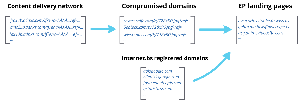 Working backward from the EP landing pages, there were two different types of referrers that transitioned from the stage one domains to the EP landing pages: redirections from a CDN through compromised sites and redirections through domains registered at internet.bs, a Bahamian registrar: