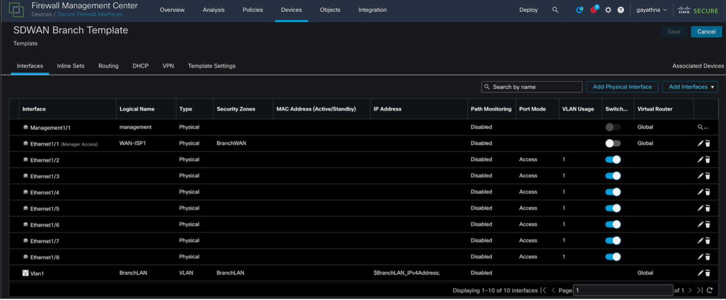 Templates can also be cloned using the export and import options, allowing for easy replication and modification across different Firewall Management Center (FMC) instances or domains. Once a template is created, it can be configured to include physical and logical interfaces, routing, DHCP, inline-sets, shared policy assignments, licenses, and other advanced settings. Use variables and your existing network objects to parameterize template for device specific configurations, and model mapping ensures that interface configurations are correctly applied to different device models.