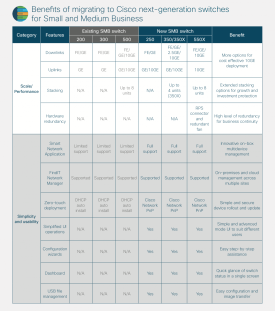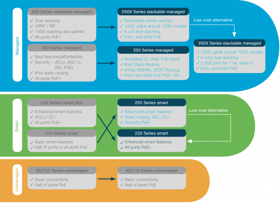 The new portfolio includes 550X, 350X, 350 and 250 Series switches to replace the current 500, 300 and 200 Series. There is no change to 220 Series smart switches and 110 and 95 Series unmanaged switches. They will continue to be integral parts of the Cisco SMB switching portfolio.