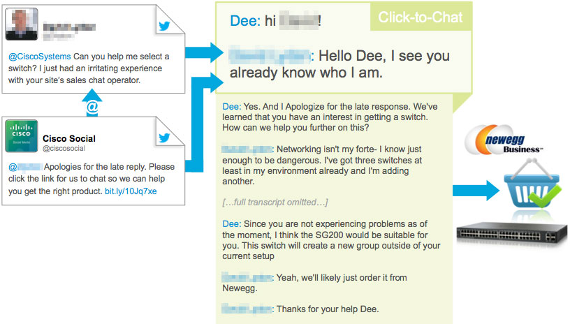 After ending an unsuccessful chat session, and reverting to Twitter for help, the customer left knowing exactly which product to purchase, even located a reseller, and gave the chat agent an “excellent” review before ending the session.