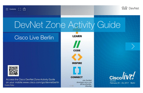 Not exactly sure where to go in the DevNet Zone to learn, code, get inspired, and connect? For the answers, enter the mobile-friendly, digital DevNet Zone Activity Guide. Use the guide to find panels, classrooms, workshops, demos, and more. You can also use it to dive into what we offer by each technology. Maybe you want to check out what’s happening with Networking? We’ve got that. What about IoT and Collab? We have that too. Here’s a couple of guide highlights (be sure to click the arrows in the book to read more about each topic):