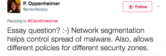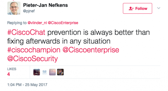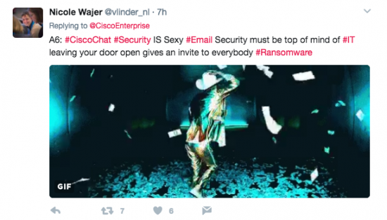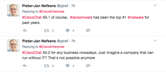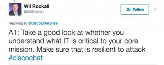 Check out the full chat on our Storify archive. For more on securing your network against ransomware, check out our free ebook, Ransomware Defense for Dummies. To everyone who participated in our May 25th #CiscoChat: Thank you! We enjoyed the opportunity to have a conversation with you. We hope you were able to take away something that will help you improve your own network cybersecurity. Join us for another Chat soon!