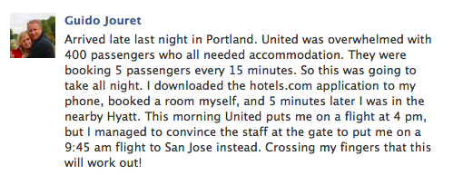 When you are connected to the Internet, travel apps work so well because they reside in the cloud where content is updated dynamically in real time, giving you access to the latest information. My Facebook friend and Cisco colleague Guido Jouret used this to his advantage when his long flight to SFO was diverted recently after a European vacation.