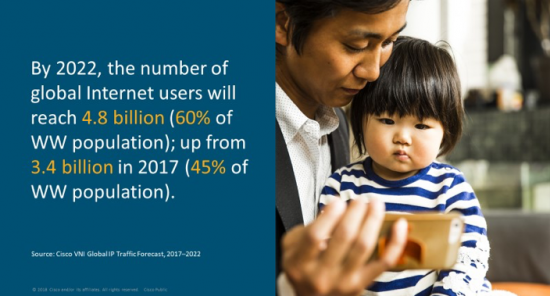 This week, we released our annual Cisco Visual Networking Index (VNI) Complete Forecast, which covers global, regional, and country-level projections and trends associated with fixed and mobile networks. The full report includes information and analysis on devices/connections growth, IoT advances by industry vertical, IPv6 adoption, traffic growth by application (video, AR/VR, gaming, et al.), traffic patterns (peak vs. average), network transformation at the edge, cord cutting implications, a 5G mobile preview, Wi-Fi hotspots, broadband network performance and network security issues. Once again, the team has developed a great deal of information (some updated and some new). Over the next few weeks, each of the senior analysts responsible for the VNI Forecast will provide blogs that explore various key findings from the updated forecast and their global implications. For this week, I’ll focus on two top-level takeaways for you to ponder.