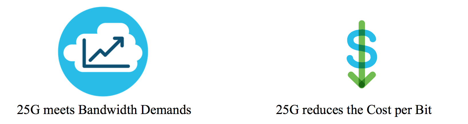 25G provides 2.5x the bandwidth of 10G at a slight increase in cost. The result is nearly a 50% reduction in the cost per bit.