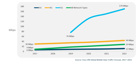 Figure 3: Global Mobile Average Speeds by Network Type, 5G speeds will reach 170 Mbps by 2022