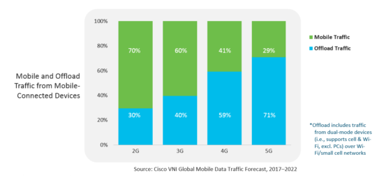 In fact, by 2022, offload from cellular to Wi-Fi will be even higher on 5G compared to 4G and 3G because 5G devices will be even more media-centric, and the users on 5G will consume more media and video and switch to Wi-Fi when possible due to data caps. The reason is that when a new generation of technology with higher speeds is introduced, it does tend to have a higher offload rate. 4G did too, at first.