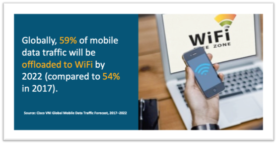 - Globally, 111.4 exabytes of mobile data traffic will be offloaded to Wi-Fi by 2022 compared to 13.4 exabytes in 2017 (on a monthly basis).