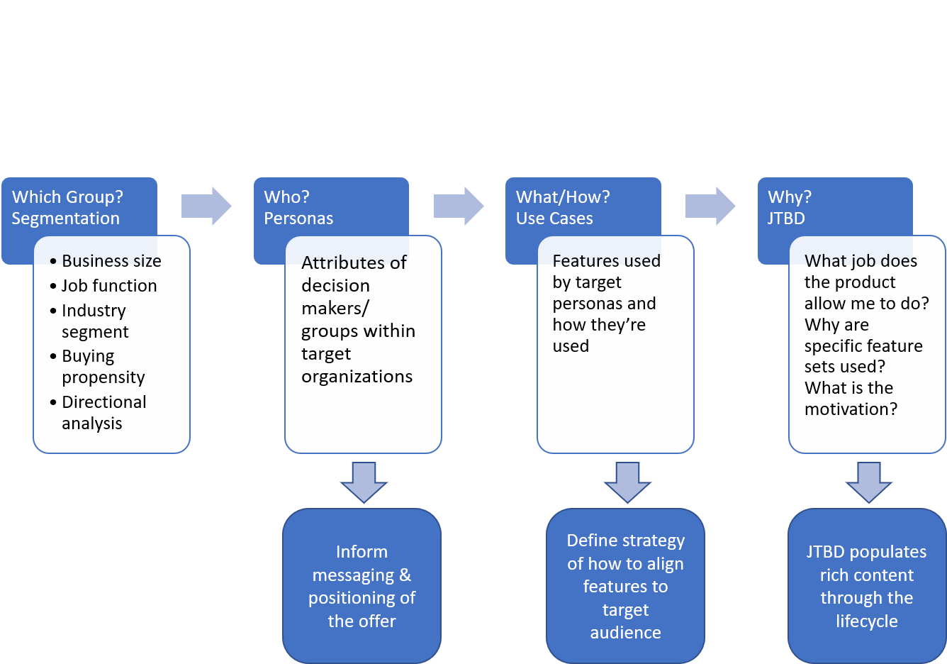 JTBD asks more evocative questions and delivers different outcomes than more traditional persona and use case messaging frameworks. While personas address ‘who’ and use cases answer ‘what’ and ‘how’, JTBD gets directly to ‘why’. I’m (clearly) no designer, but this is the flow as I think of it: