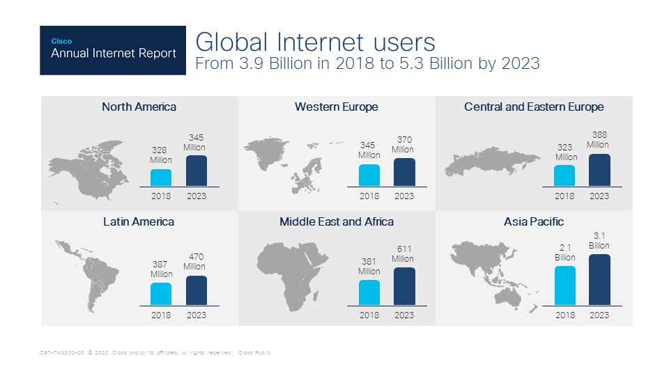 According to the new Cisco Annual Internet Report, two-thirds (66%) of the global population will be Internet users by 2023. The North America region will have the highest Internet adoption from 2018 to 2023 (92% of the region’s population by 2023). The fastest-growing region will be the Middle East and Africa (10% compound annual growth rate [CAGR]) throughout the forecast period.