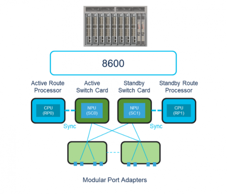Similar to distributed systems, centralized systems have in-service, replaceable, redundant RPs with CPU and redundant switch cards (SCs) with NPUs to support both data plane and control plane redundancy. Cisco 8600 Series Routers have modular port adapters (MPAs) that can be replaced while in service and enable interface flexibility. Like fixed systems, the forwarding decisions on centralized platforms are handled centrally on the RP/SC instead of the line card.