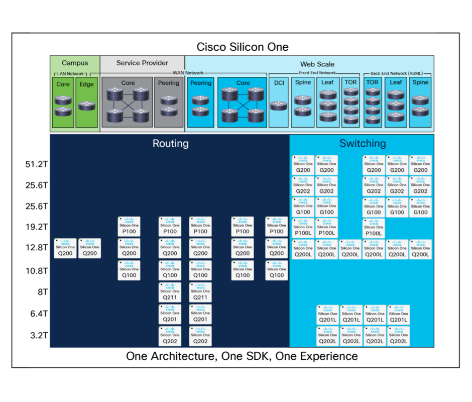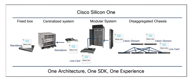 Silicon One architecture achieves high performance and full routing capabilities without external memories. The clean-sheet internal architecture includes on-chip high-bandwidth memory (HBM) and supports multiple modes of operation by enabling a router to operate with a single forwarding chip, a line card network processor, and a switch fabric element. This flexibility enables consistent software experience in multiple roles and rapid silicon evolution.