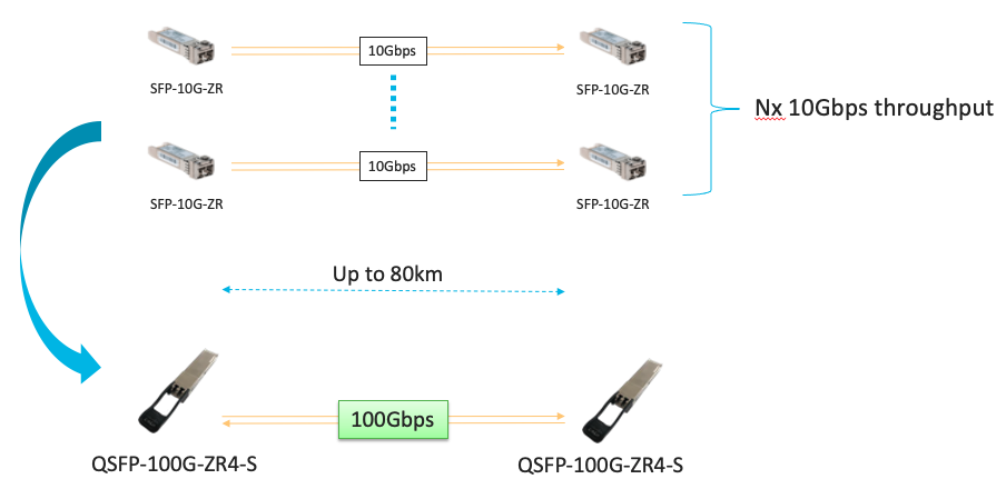 - Connecting to a regional data center: To reduce IT operating costs, businesses are offloading applications to the cloud. With the QSFP-100G-ZR4-S, organizations can reliably transmit more data across high speed links to data centers over distances of up to 80km.