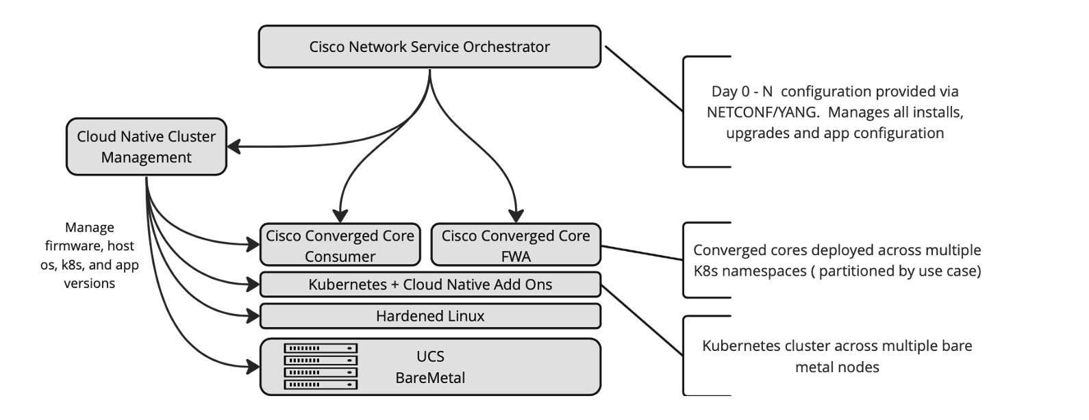 Managing day-0 install / day-n upgrades of NFV architectures can be challenging with multiple integration points into different orchestrators in the MANO stack, resulting in long integration times and a relatively fragile solution. For the Cisco Converged Core team, a stable cloud-native stack was a critical component, as was automated lifecycle management for all layers – not just the application layer. As a result, Cisco developed a cloud-native cluster management layer that ensures consistent software and tunings across all layers – BIOS settings, firmware, host OS, Kubernetes, and application versions. This experience is so simple that upgrading the Cisco Converged Core has become a two-step operation – step one, select your new software version and then step two, commit it to the cluster. To facilitate automation, the cluster management layer provides CLI, REST, and NETCONF interfaces. Support for a wide range of interfaces enables seamless integration into a mobile service provider’s existing automation solution – such as Cisco’s Network Service Orchestrator (NSO).