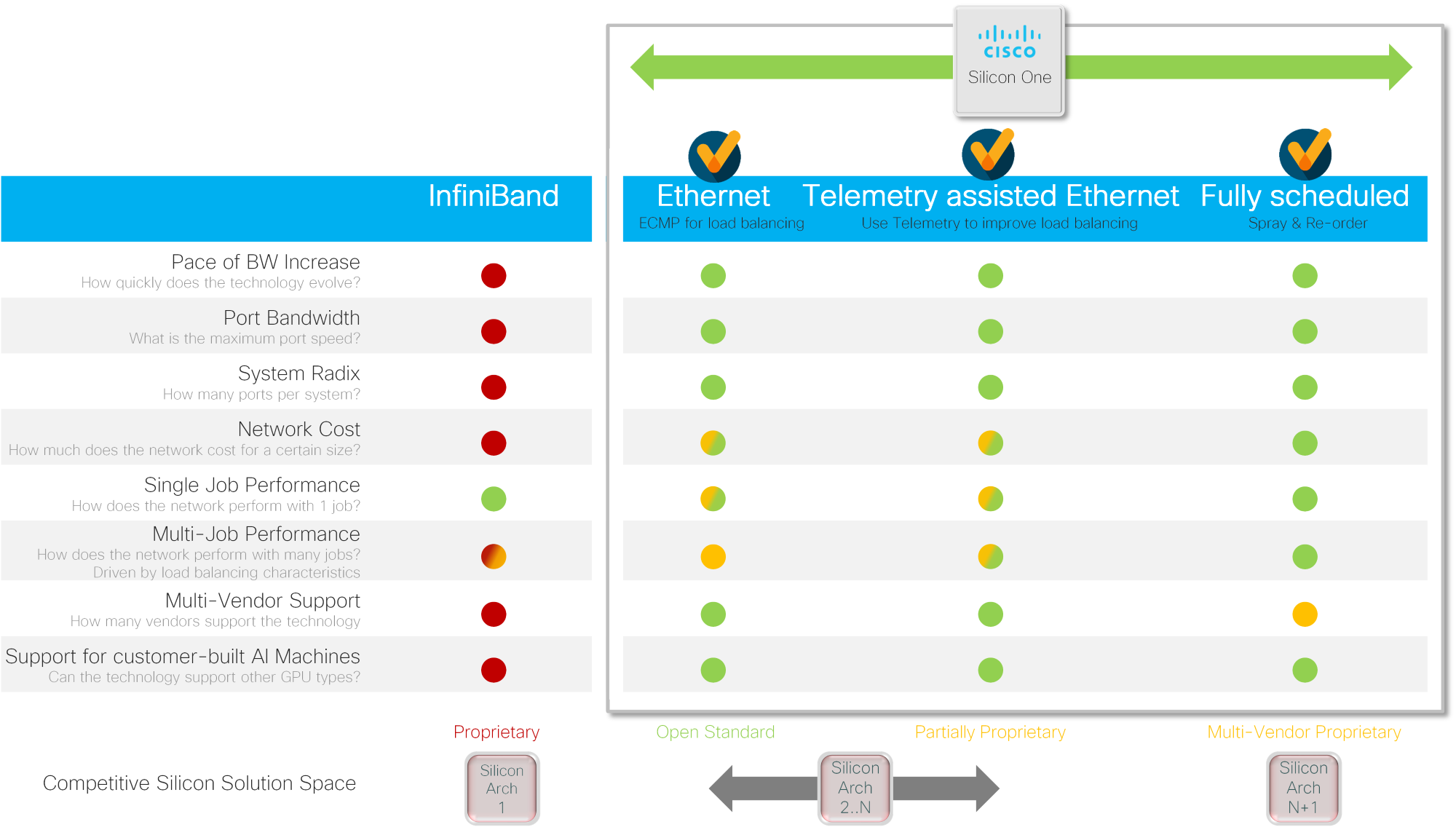 Cisco Silicon One, however, gives customers the flexibility to program their network into various operational modes and provides best-of-breed characteristics in each mode. Because Cisco Silicon One can enable multiple architectures, customers can focus on the reality of the data and then make data-driven decisions according to their own criteria.